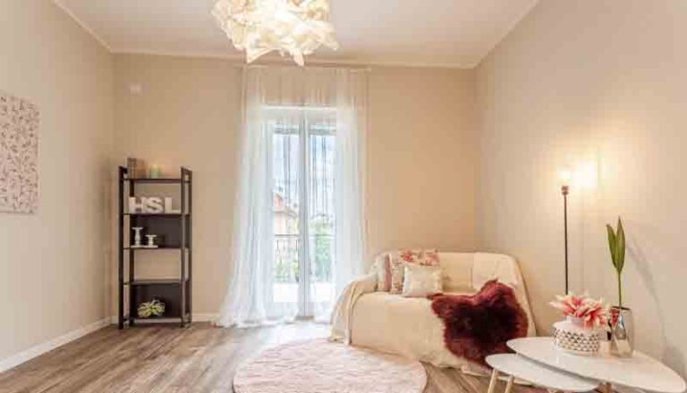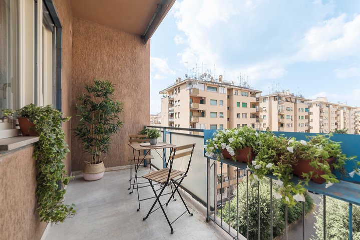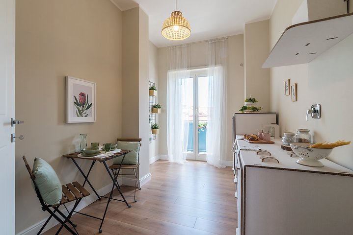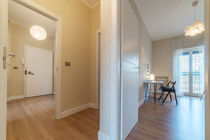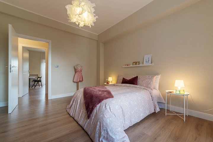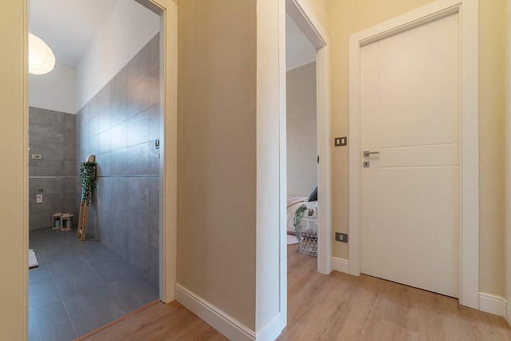 Entrando nell’immobile troviamo un ingresso che ci conduce nel salone della casa dal quale si accede al primo balcone, adiacente abbiamo la cucina abitabile con uscita sul secondo balcone della casa, proseguendo nella zona notte troviamo una camera matrimoniale con accesso al primo balcone, seconda camera da letto con uscita sul secondo balcone della casa, servizio finestrato ed infine ripostiglio.